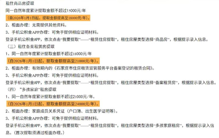 以石家庄为例,单人年度租房提取上限提高至1.8万元,持有备案租赁合同的提升至2.1万元,有二孩的提升至2.4万元,折合每月1500元至2000元,基本可覆盖租房支出。
