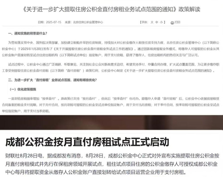 北京、成都正试点公积金直付房租,即由公积金中心直接向房东支付租金,个人无需垫付资金,也无需跑腿报销,可直接留存自身收入。