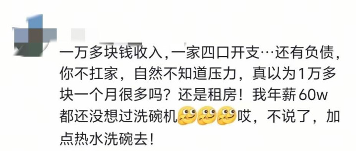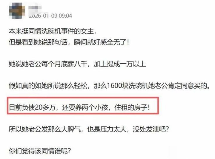 李某的强硬态度背后有隐情。两人租房居住,背负20万元债务,妻子失业一年导致家庭开支全压在他肩上。“每月房贷、车贷、孩子开支,收入刚够填沟壑”,李某在社区群聊中透露。他强调洗碗机属“非必要消费”,每月水电费增加几十元,长期会雪上加霜。