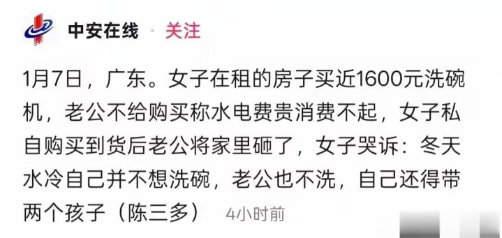 近日,广东一对夫妻因1500元洗碗机引发的激烈冲突,在网络上掀起轩然大波。全职妈妈因冬天冷水洗碗太苦,偷偷网购了洗碗机,丈夫知晓后情绪爆发砸毁家中物品。这场看似因小事引发的争吵,背后藏着更深刻的夫妻矛盾。